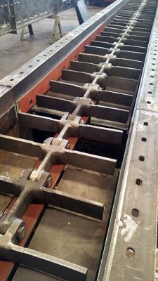 The ash conveyor is installed in a huge steel sheet slide. A link chain with multiple welded beams is used. The engine is mounted in the lower part of the area. Each part is manufactured protected from corrosion.