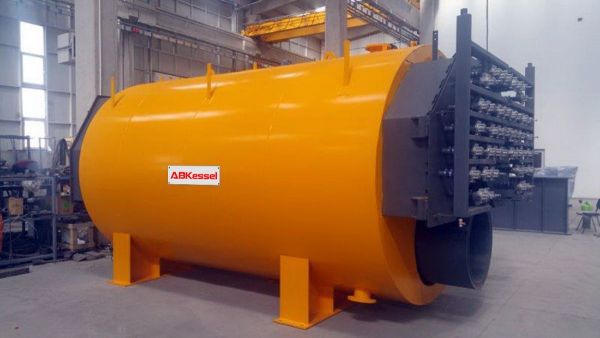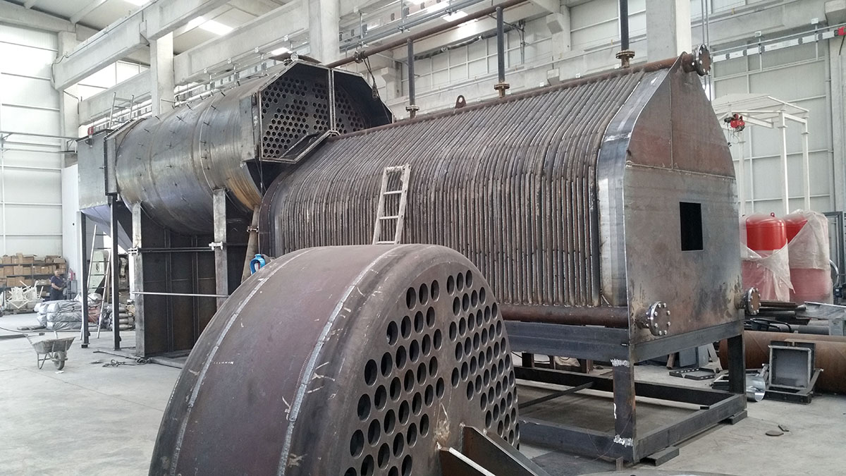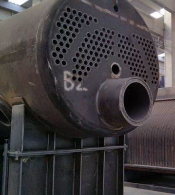 Carbon steel horizontal heat exchanger with 2/3 turns of smoke with "Wet Back" technology suitable for heat exchange between high temperature smoke and water.